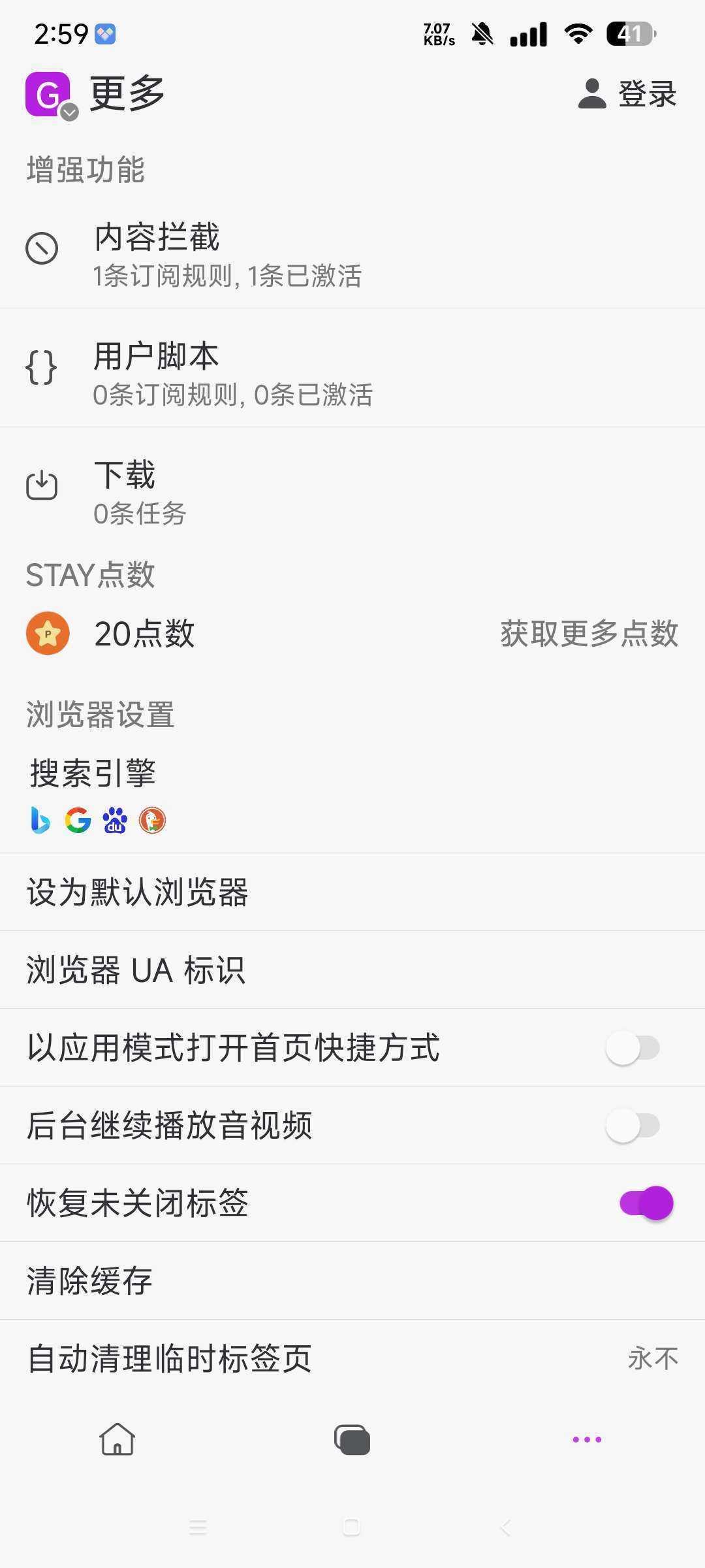 【应用名称】Stay浏览器 【应用版本】1.5.3 【软件大小】30M 【适好平台】安卓 【应用简介】一款备受大家喜爱的安卓浏览器,不仅为用户们提供了美观简约的UI界面设计,还更是提供了流畅、极简、轻便的上网体验 【下 ...