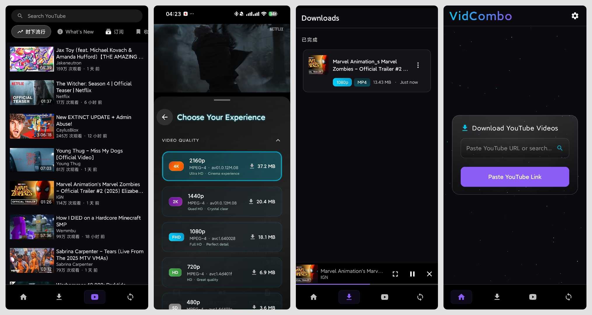 【应用名称】:Vidcombo 【应用版本】:3.0 【应用大小】:31 MB 【适用平台】:Android 【软件介绍】:Vidcombo是一款专为YouTube设计的视频观看和下载工具,它允许用户无需登录即可轻松下载高达4K分辨率的视频 ...