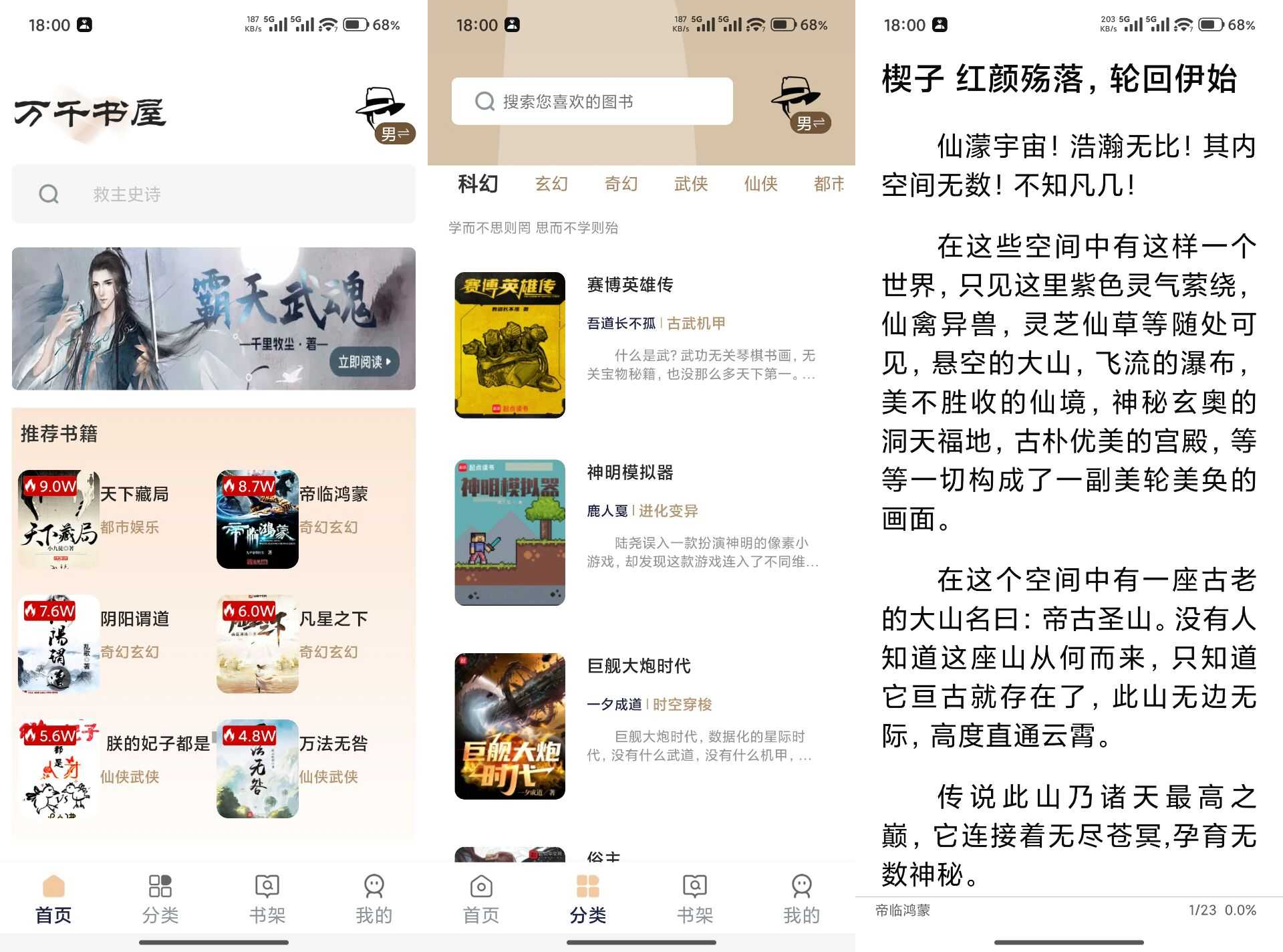 【软件名称】:万千书屋 【软件版本】:1.7.3 【软件大小】:68.36M 【测试系统】:小米 【使用说明】:一款资源全面的免费追书神器,用户可以在上面找到各种类型的小说,包括言情小说、玄幻小说、都市小说等,用户 ...