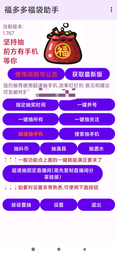 【应 用 名 称】:福多多福袋助手 【应 用 版 本】:1767 【应 用 大 小】:2.26M 【应 用 介 绍】:福多多福袋助手app是一款好用的福袋助手软件,通过这款软件应用可以不停的在直播间自动抽取福袋,是能够获取到好 ...