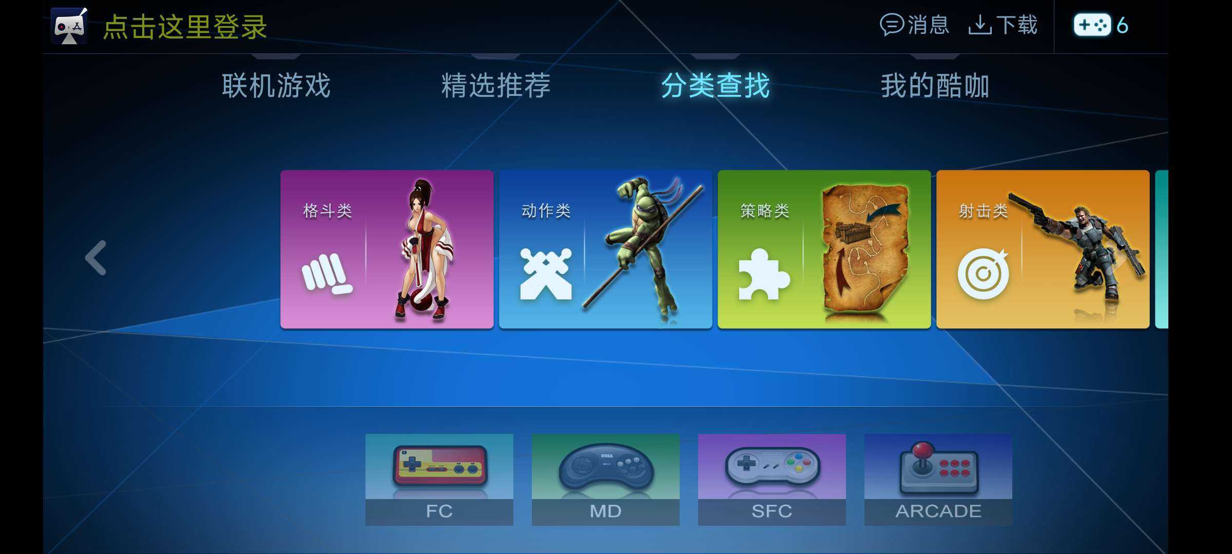 【应用名称】酷咖游戏 【应用版本】1.4.5 【软件大小】23mb 【适用平台】安卓 TV 【应用简介】酷咖游戏集合了街机游戏、FC游戏、MD游戏以及SFC游戏等众多经典游戏,涵盖了射击类、格斗类、动作类、策略类、赛车类、 ...