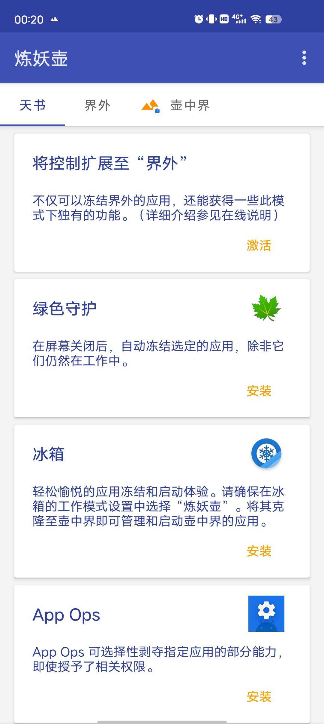 一款功能强大的应用双开工具,通过安卓虚拟化技术构建的一个虚拟空间,界面简洁,运行稳定 🎉【软件名称】炼妖壶 极速双开 完全免费 👁️【软件大小】3MB 🤖【软件版本】6.41 🌐【测试 ...