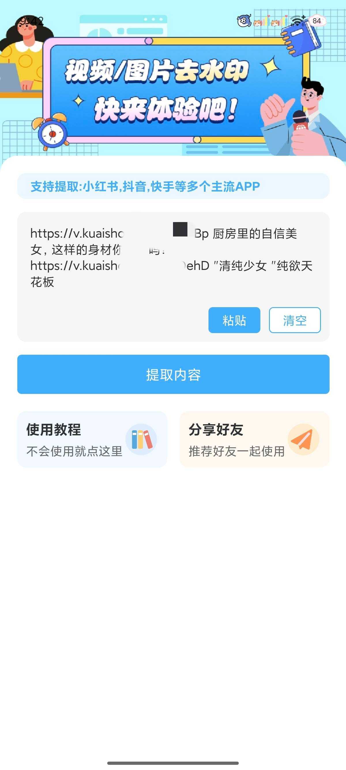 支持多个短视频平台的去水印视频下载;支持图集视频混合批量解析下载 🎉【软件名称】青青去水印 👁️【软件大小】17MB 🤖【软件版本】v1.1 🌐【测试机型】安卓14 🐽【软件介绍】 ...