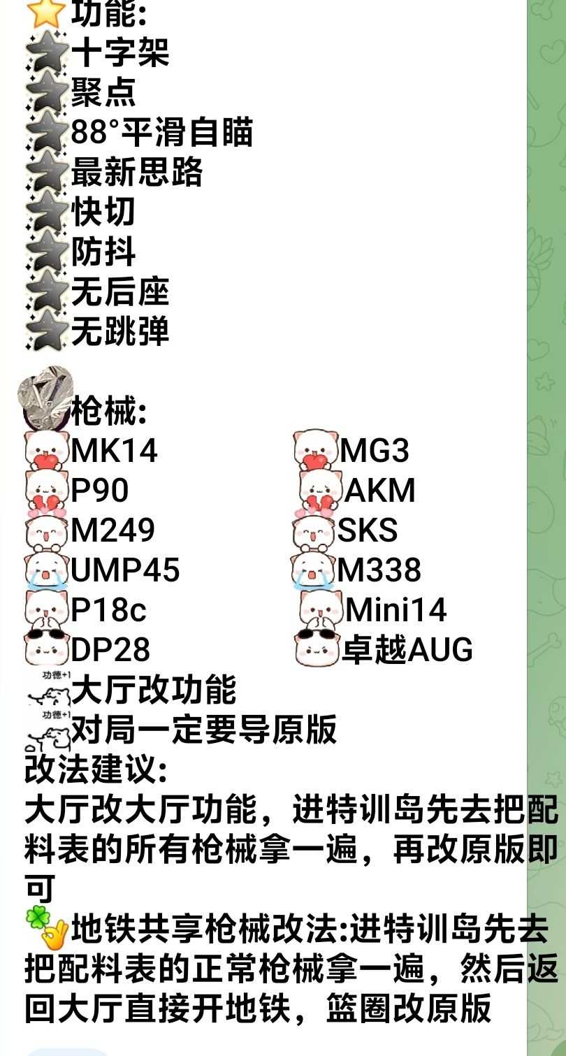 ⭐️功能: 🖤十字架 🖤聚点 �°平滑自瞄 🖤最新思路 🖤快切 🖤防抖 🖤无后座 🖤无跳弹 🌟枪械: ❤️MK14 ❤️MG3 💔P90 ...
