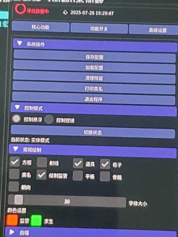 【永久免费使用1.3更新】 1.新增地图除雾 2.新增地图显棺材 3.新增范围拾取 4.新增广角 5.新增无视游戏更新 6.新增虚拟传送 [传送和广角还有问题:不建议使用] 教程:在大厅点击悬浮窗的主页点击获取数据,内存功 ...