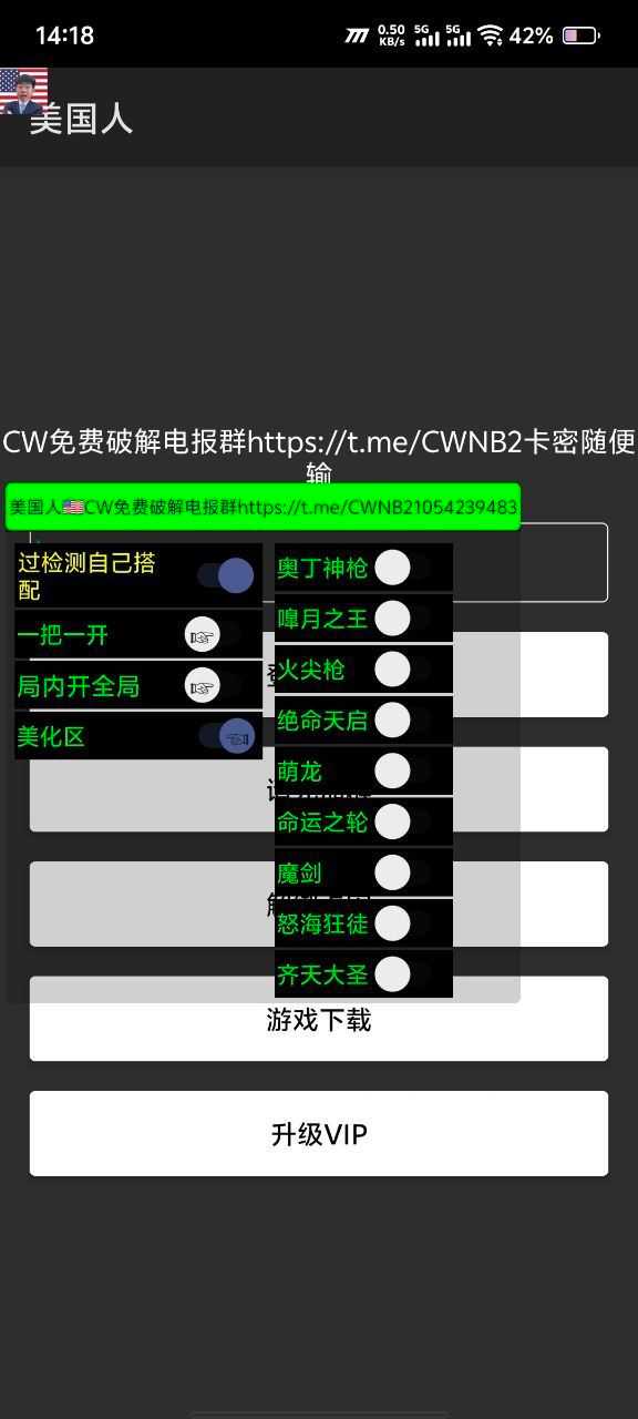 上号大厅开启功能即可 无须root虚拟机框架,下载安装即可 包更新 功能: 内透 查看敌方大招血量 修改全皮肤 自瞄 高视野上帝视角 解锁120帧高帧率 全皮肤可用 拿走吱吱一声 链接:  https://caiyun.139.com/w/i/2o ...