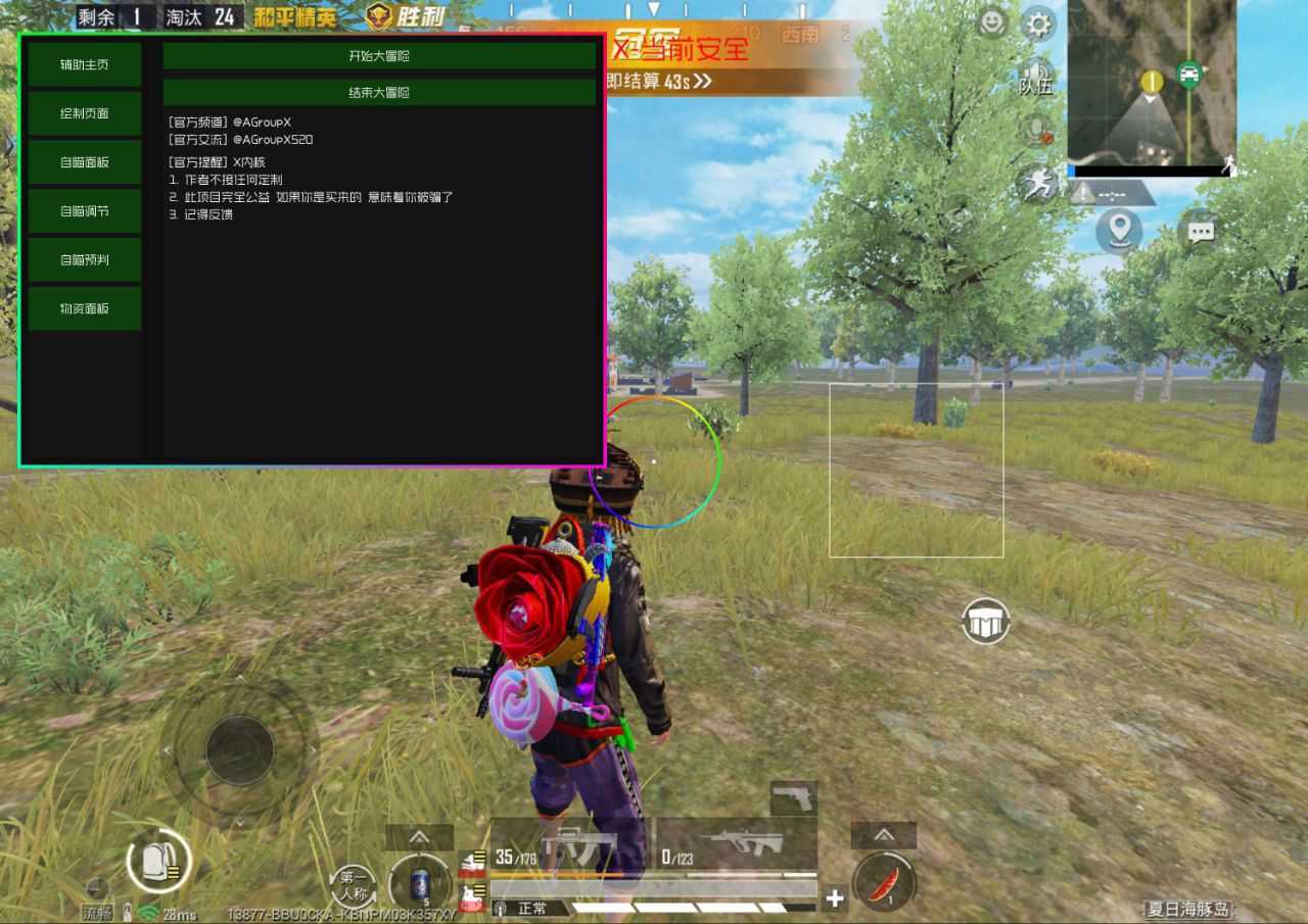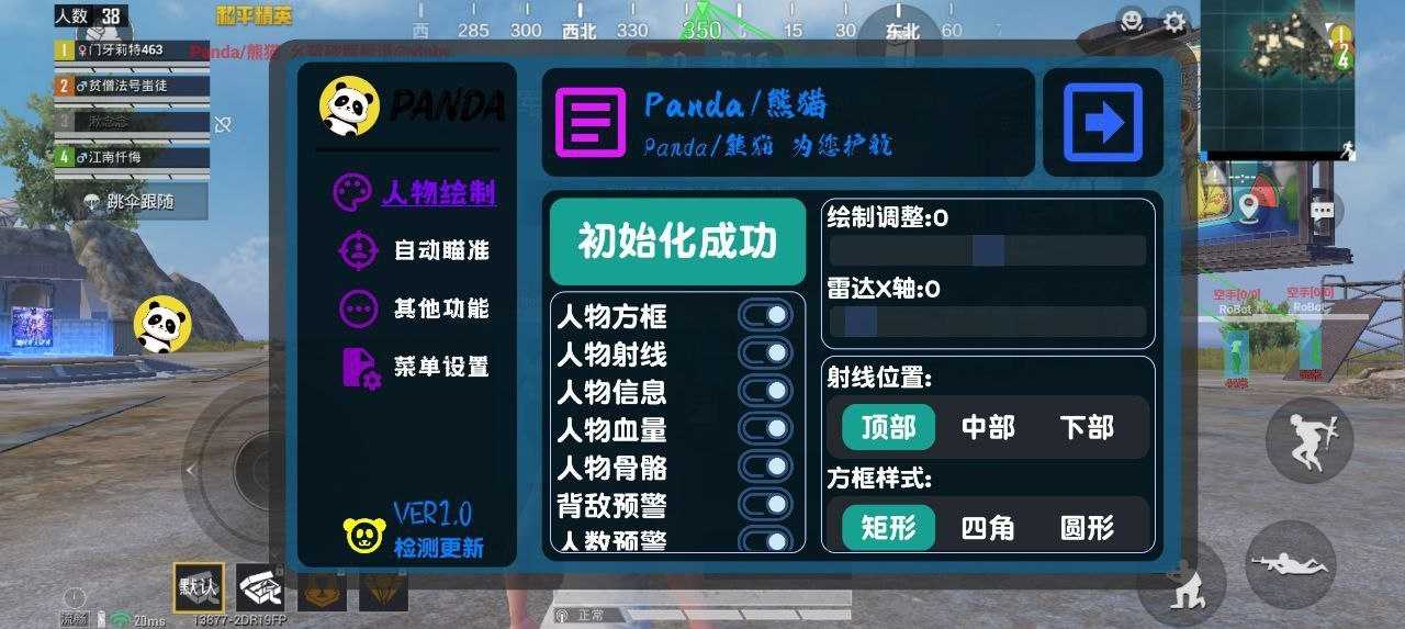 更新公告6.4 1. 修复部分机型掉框问题 2. 加入Java防封文件 3. 更换c++编写全防 4.夕颜诺雪防伪 功能描述 1. 人物骨骼,射线,框架,距离背对敌人显示,人数显示等经典绘制功能 2. 物资绘制有常驻大金与大杂等箱子绘 ...