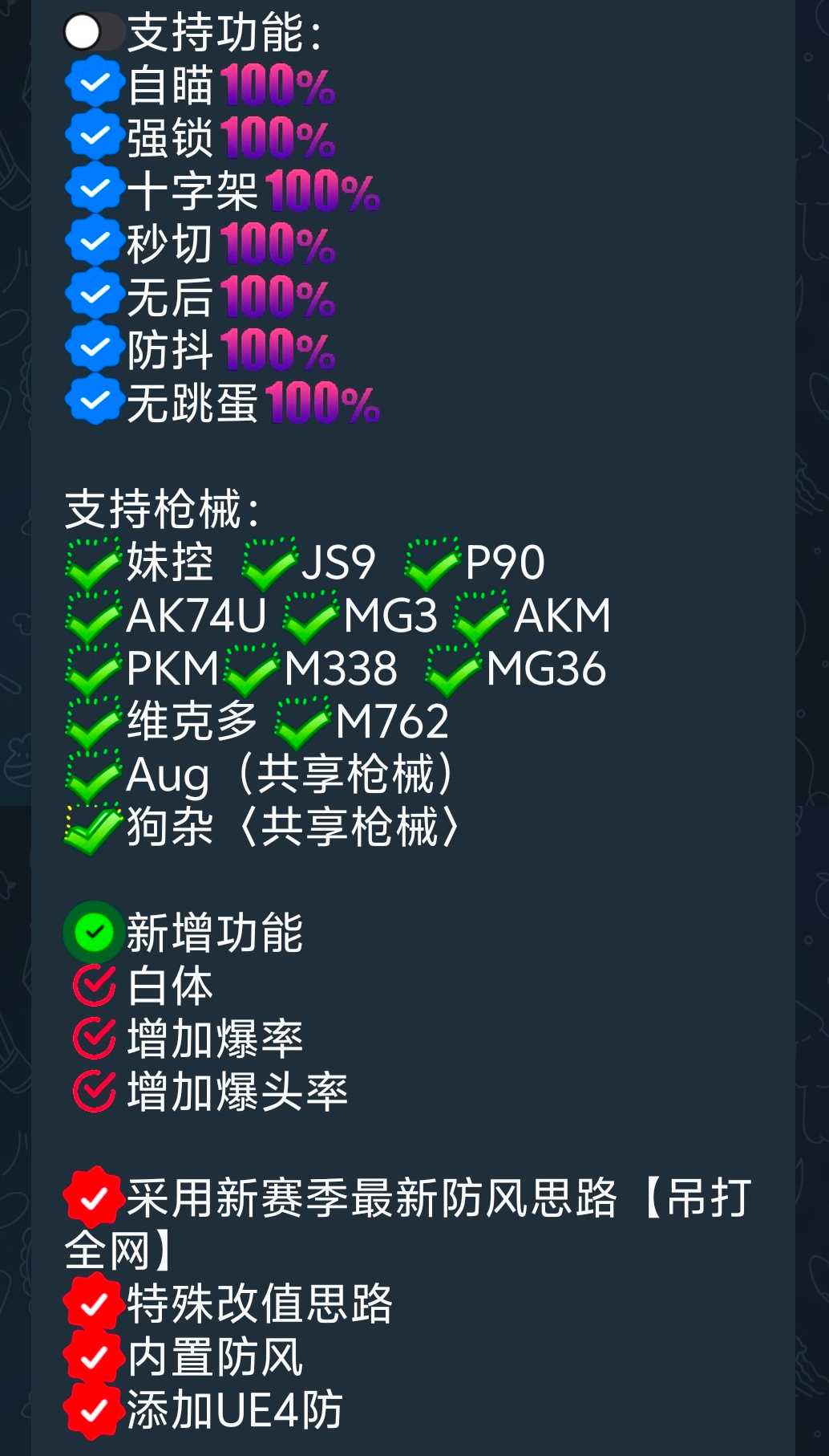 【应用名称】:小月泛滥祈愿内部v6(稳定版) 【应用版本】:v6 【应用大小】:1.6MB 【应用介绍】: 🎚支持功能: ✅自瞄😃😃 ✅强锁😃😃 ✅十字架😃😃 ✅秒切ԅ ...