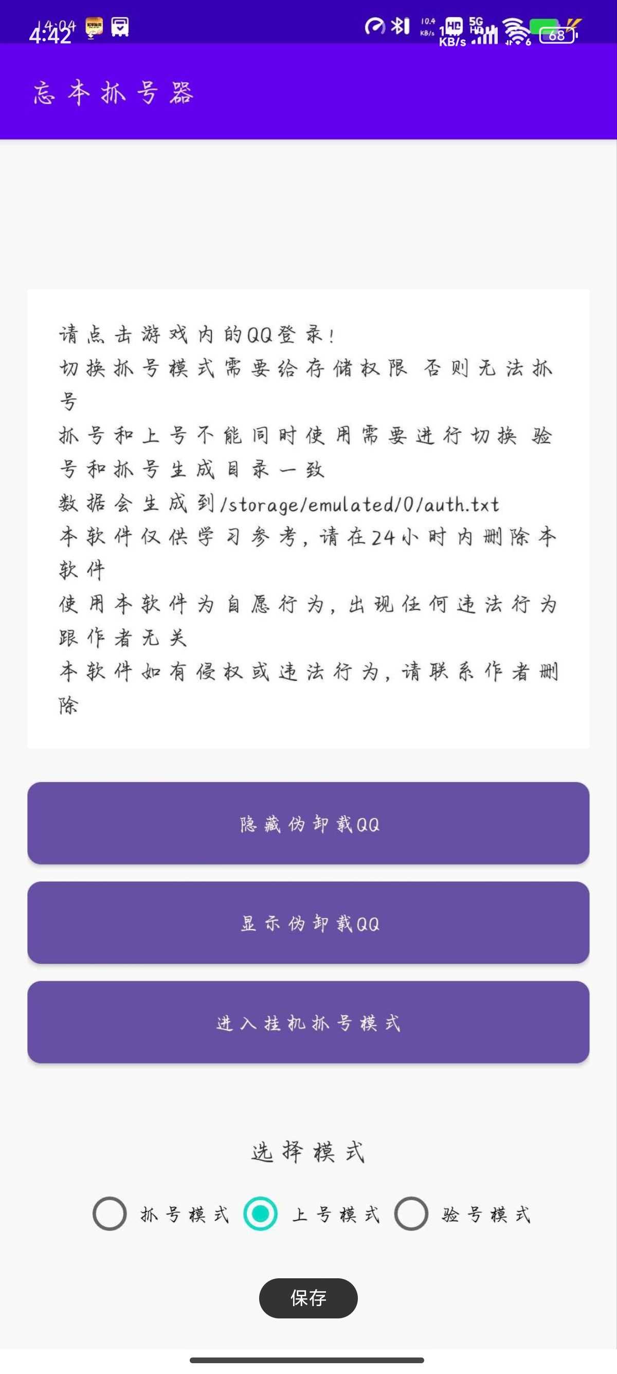 介绍:不需要root!也不用删QQ 上号的时候把QQ隐藏了或删了就行 可以切换不同的模式 上号,抓号,验号 可以抓号上号和验号的多功能软件 不会抓号的可以看过来 链接在下面 链接:https://pan.baidu.com/s/1hUohUfYGn2D ...